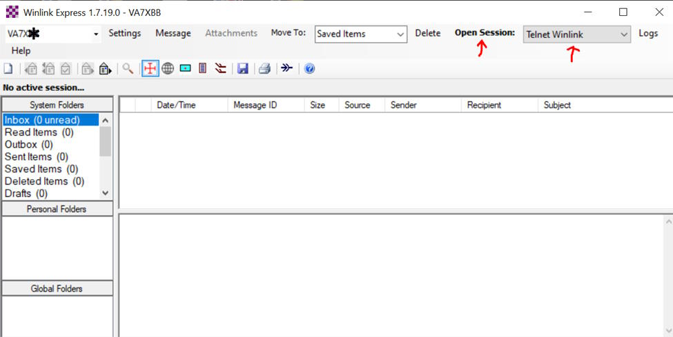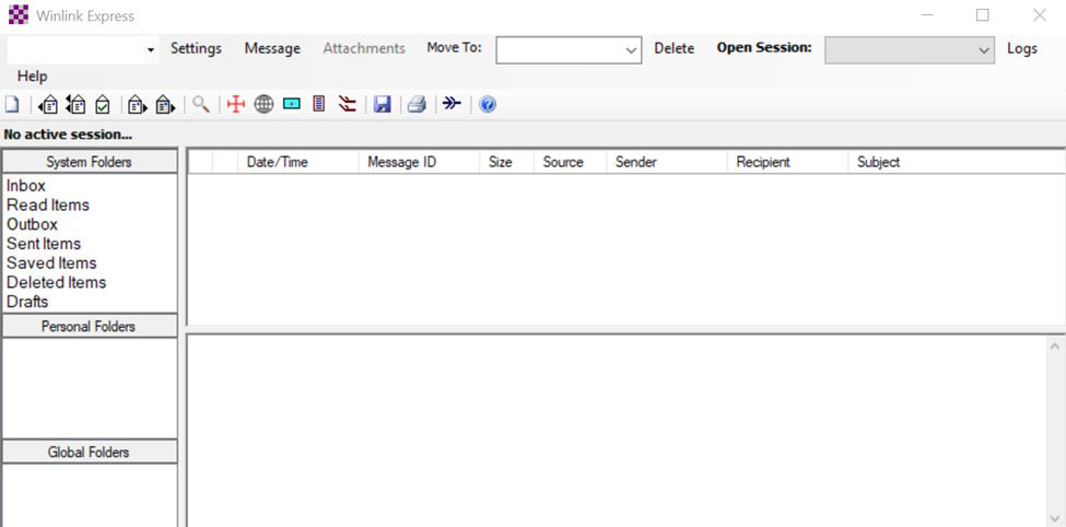 Winlink client will launch and present the main screen: