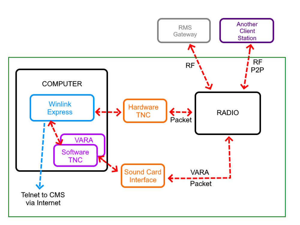 Winlink VARA Station : A Winlink VARA station will consist of a Windows PC with Winlink Express and VARA software installed, soundcard interface and a radio. If a you add a Software TNC in the PC, you can do packet as well.