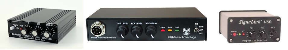 Some examples of Soundcard Interface are DRA Radio Adapter by Masters Communications, RIGblaster by West Mountain Radio or Signalink by TigerTronics. See images below: